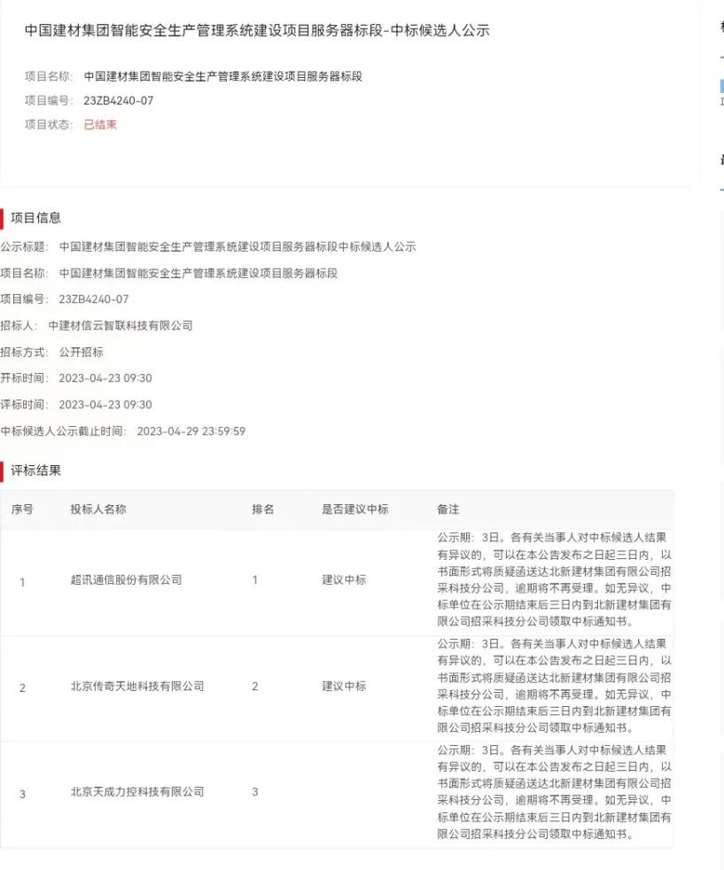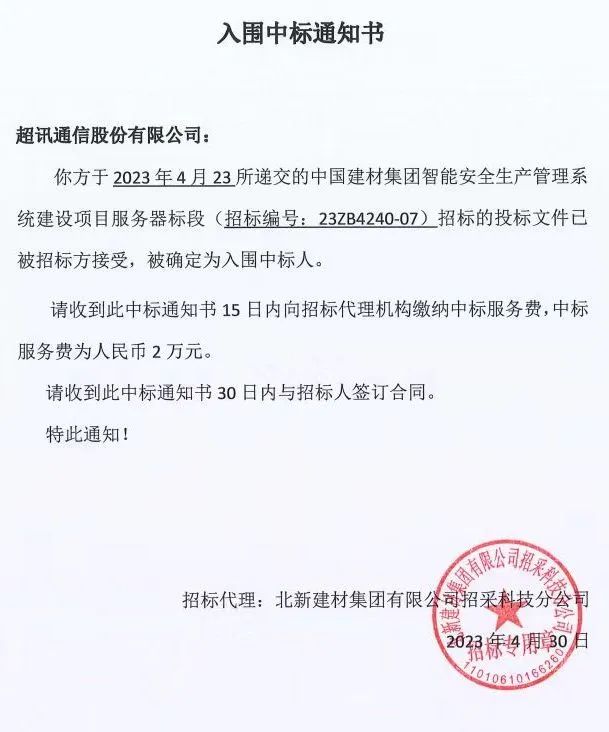 近日,我司成功中標(biāo)中國建材集團(tuán)智能安全生產(chǎn)管理系統(tǒng)建設(shè)項(xiàng)目服務(wù)器標(biāo)段,預(yù)估中標(biāo)份額3千萬,采購內(nèi)容:算法服務(wù)器、智能安全平臺(tái)服務(wù)器、人員定位服務(wù)器、數(shù)據(jù)安全服務(wù)器等。該項(xiàng)目的成功中標(biāo),標(biāo)志著超訊通信在大數(shù)據(jù)中心領(lǐng)域?qū)崿F(xiàn)新的突破,業(yè)務(wù)由IDC建設(shè)運(yùn)維服務(wù)向算力基礎(chǔ)設(shè)備拓展。