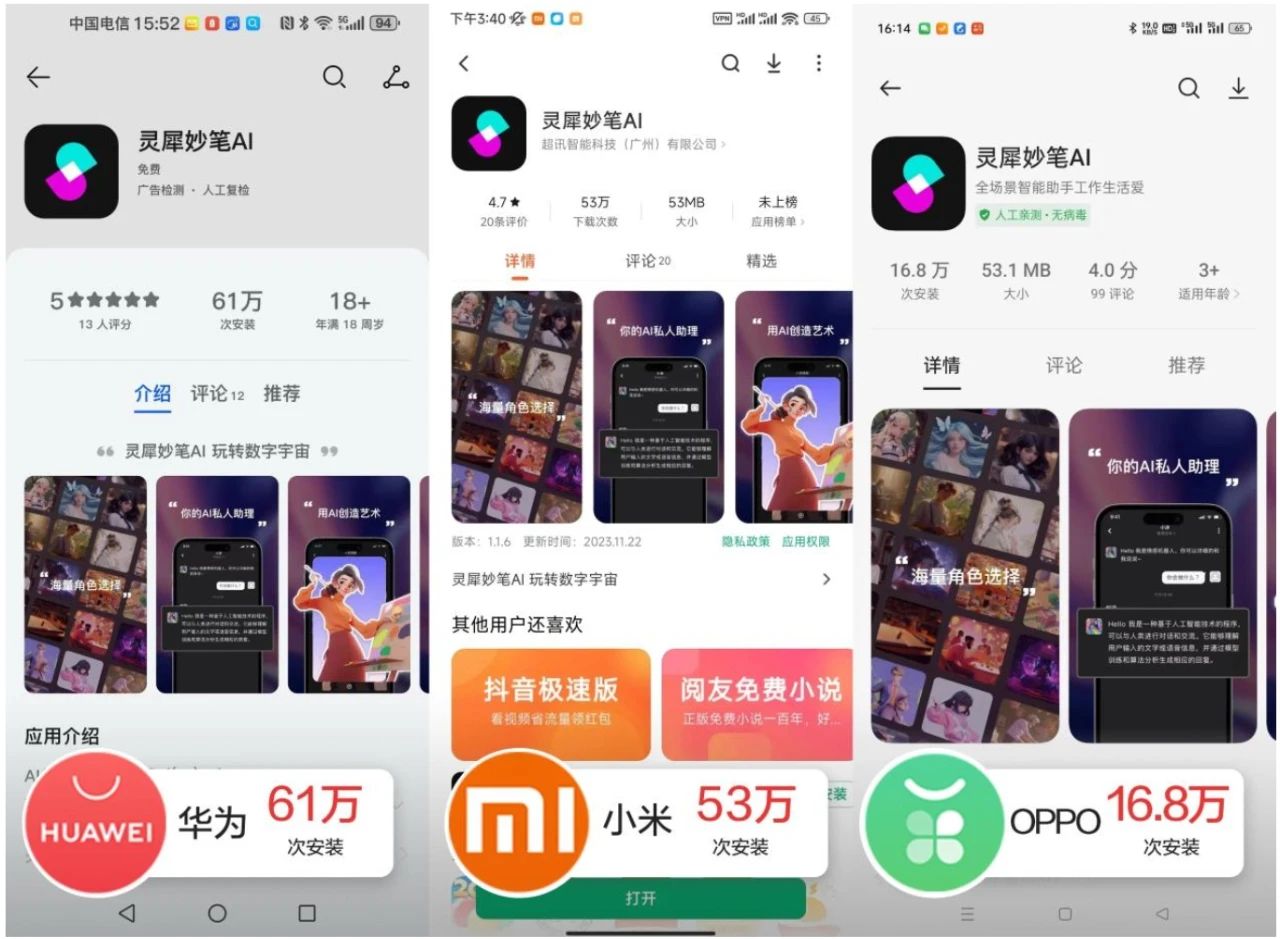 截止2023年12月01日,靈犀妙筆AI在華為商店突破61萬(wàn),小米商店突破 53萬(wàn),OPPO商店突破16.8萬(wàn),三大主流手機(jī)應(yīng)用市場(chǎng)下載量總數(shù)突破100萬(wàn)!